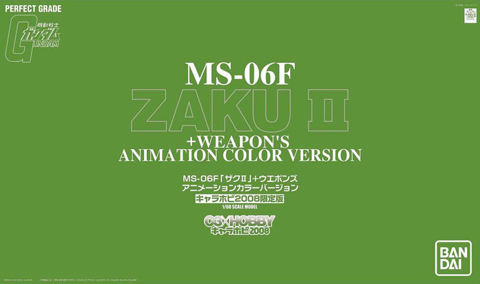 C3×HOBBY 2008会场限定发售。改自PG MS-06F 扎古Ⅱ(1:60),附带扎古火箭筒、热能斧等丰富的武器配件。配色更换为颜色偏深的动画版绿色。